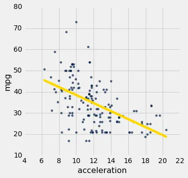 回想一下hybrid表,包含美国混合动力汽车的数据。这是燃油效率对加速度的回归。这个关联是负面的:加速度高的汽车往往效率较低。