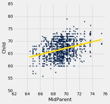 方法的基础由弗朗西斯·高尔顿爵士(Sir Francis Galton)奠定。我们在 7.1 节看到,高尔顿研究了身体特征是如何从一代传到下一代的。他最著名的工作之一,是根据父母的高度预测子女的身高。我们已经研究了高尔顿为此收集的数据集。heights表包含了 934 个成年子女的双亲身高和子女身高(全部以英寸为单位)。