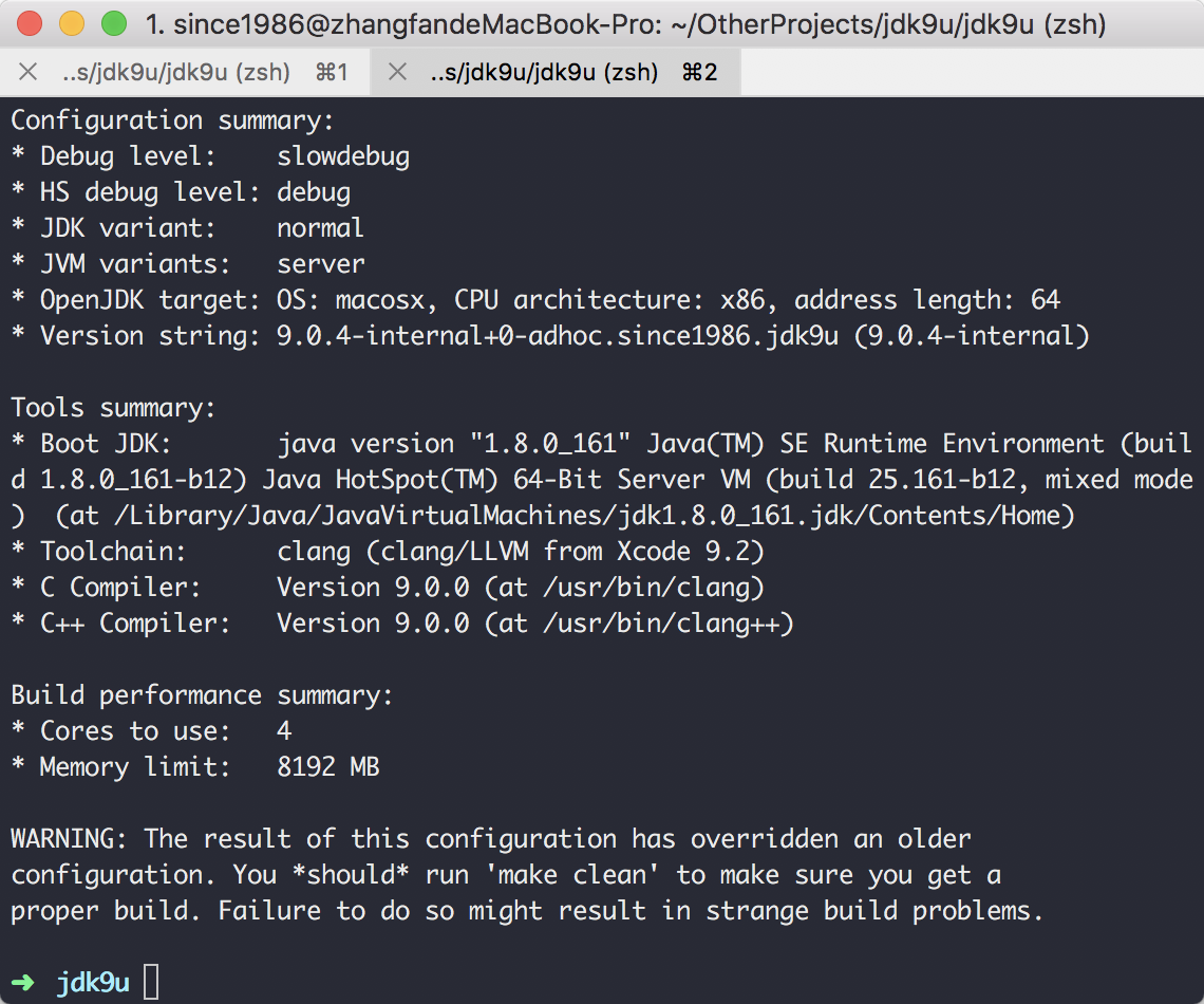 JDK 9u而不是JDK 9因为我当时编译9的时候出了一堆error,所以我想带个u的是不是会好些,当然这个有很大程度是我臆测的,我后期就都拿9u搞了,没试9,如果各位有兴趣可以自己蹚蹚这个 configure的时候一定要带上--disable-warnings-as-errors这个参数,否则编译过程中的warning也会中断编译的进程,实际上这些warning并不影响编译后的目标JDK的运行