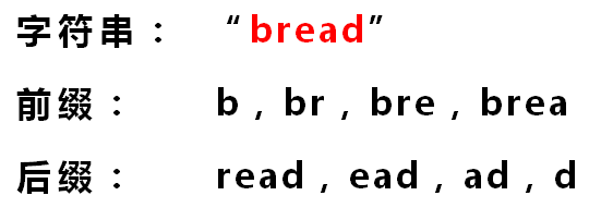 首先,要了解两个概念:”前缀”和”后缀”。 “前缀”指除了最后一个字符以外,一个字符串的全部头部组合;”后缀”指除了第一个字符以外,一个字符串的全部尾部组合。