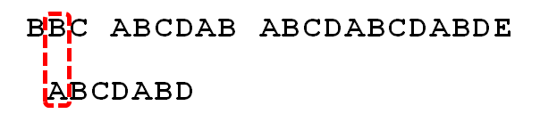 首先,"BBC ABCDAB ABCDABCDABDE"字符串的第一个字符与搜索词”ABCDABD”的第一个字符,进行比较。因为B与A不匹配,所以搜索词后移一位。