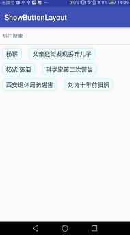for (int i = 0; i < hotWords.length; i++) { TextView view = (TextView) LayoutInflater.from(this).inflate(R.layout.hot_search_tv, mShowBtnLayout, false); view.setText(hotWords[i]); view.setTag(hotWords[i]); view.setOnClickListener(new View.OnClickListener() {//设置点击事件 @Override public void onClick(View view) { String keyword = (String) view.getTag(); Toast.makeText(MainActivity.this,keyword,Toast.LENGTH_LONG).show(); } }); mShowBtnLayout.addView(view);//添加到该view中 }