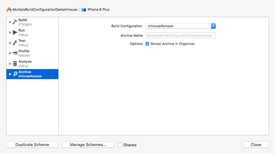 为方便我们选择配置,可以新建 scheme 来给每个 scheme 以不同的默认配置,比如新建一个 MultipleBuildConfigurationDemoInhouse scheme,关联的可执行文件是同一个 target,Archive 时使用 InhouseRelease 配置,而原有的 scheme 中,Archive 使用 DistributionRelease 配置