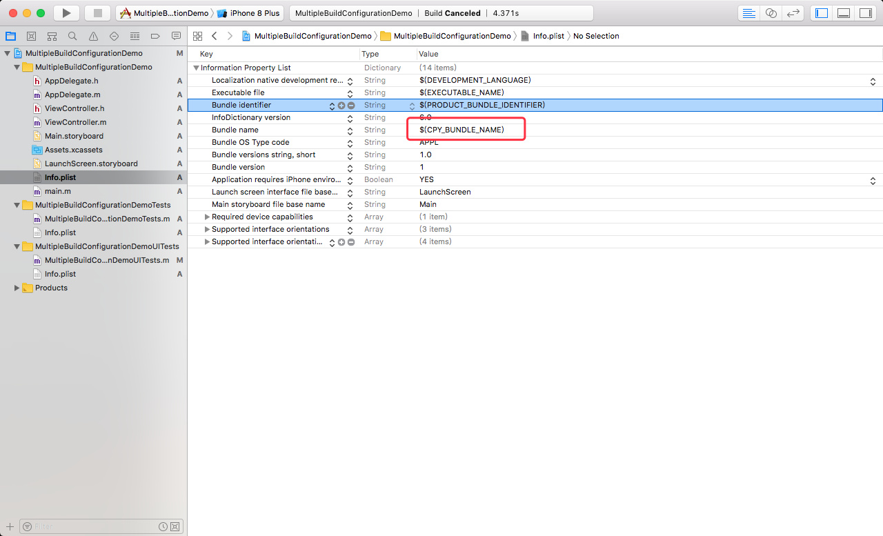 Xcode 还提供一个功能,称之为 User-defined setting,Xcode 的工程模板中有对这个功能的利用,看 Info.plist 可以注意到一些参数并没有写死,而是通过类型「环境变量」的形式引用
