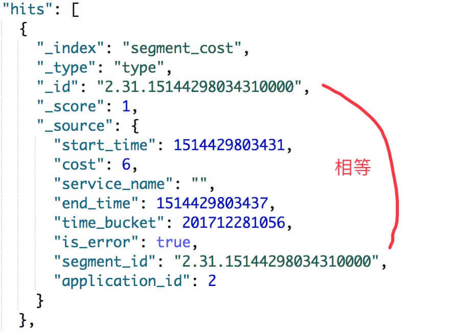 org.skywalking.apm.collector.storage.es.dao.SegmentCostEsPersistenceDAO,SegmentCost 的 EsDAO 。- 在 ES 存储例子如下图: