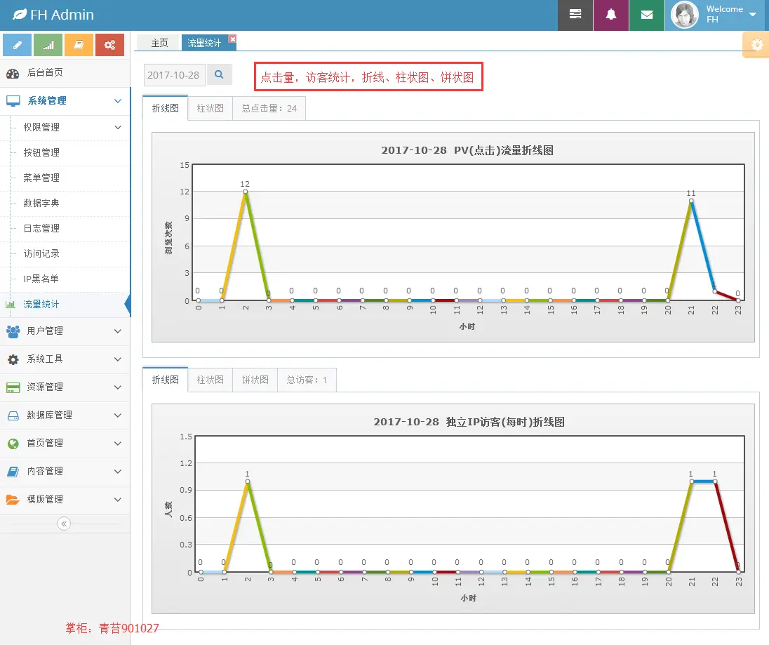 . 流量统计:pv点击量和独立IP访客访问统计,折线图、柱状图、饼状图(地区统计)