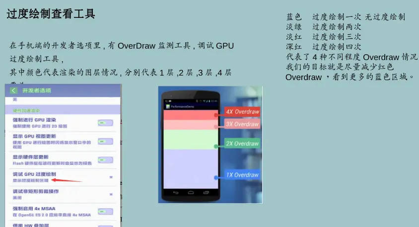 首先手机开发者选项中打开 GPU过度绘制,上图