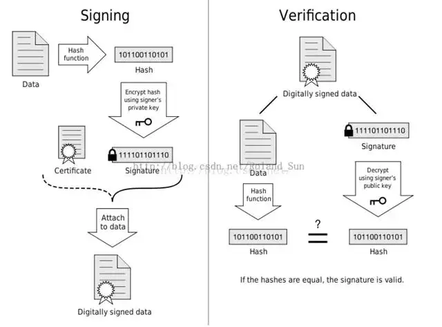 综上所述,总结一下,数字签名和签名验证的大体流程如下图所示: