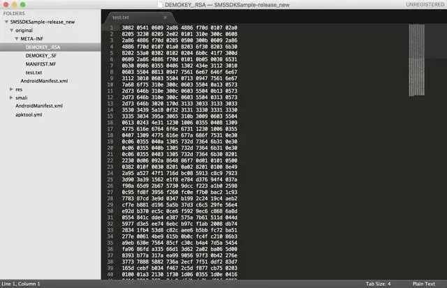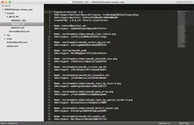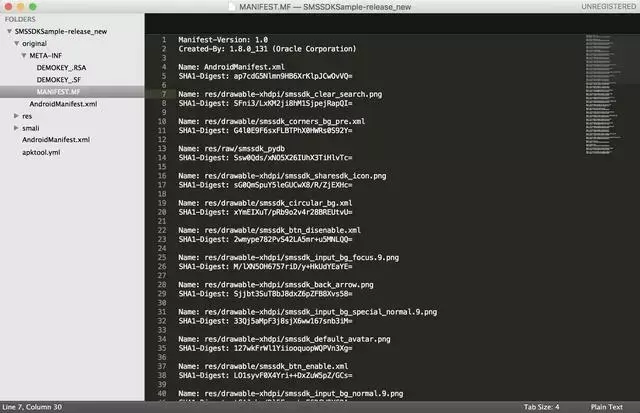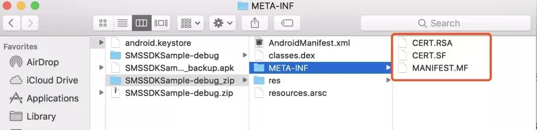 首先我们任意选取一个签名后的APK(SMSSDKSample-release.apk)解压: