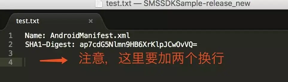 对于SHA1-Digest值的验证可以手动进行,将MANIFEST.MF中任意一个块的内容复制并保存在一个新的文档中,注意文末需要加两个换行(这是由signapk的源码决定的)