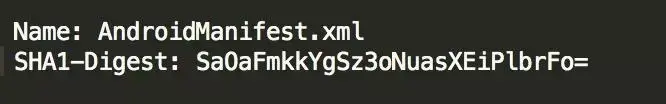 该 文件中保存的内容其实就是逐一遍历apk中的所有条目,如果是目录就跳过,如果是一个文件,就用SHA1(或者SHA256)消息摘要算法提取出该文件的 摘要然后进行BASE64编码后,作为“SHA1-Digest”属性的值写入到MANIFEST.MF文件中的一个块中。该块有一个“Name”属性, 其值就是该文件在apk包中的路径。