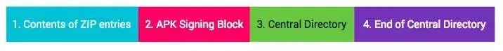 为了保护APK内容,整个APK(zip文件格式)被分为以下4个区块: