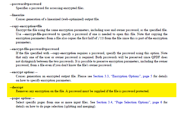 - options:需要使用的命令。下图是可以使用的命令的一小部分,其中黄色标注的的--decrypt 是我们需要的命令。这里很明显的提到:如果PDF打开时需要密码,则需要提供密码,这里仅仅移除文档的权限加密。