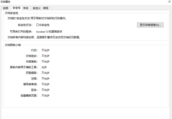 来看看一篇加密的pdf文档有哪些权利受到了限制(访问文档属性-->安全信息)。