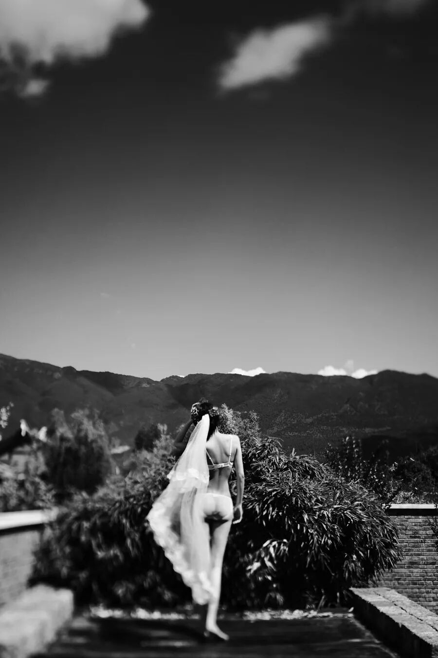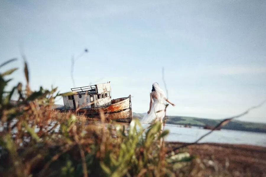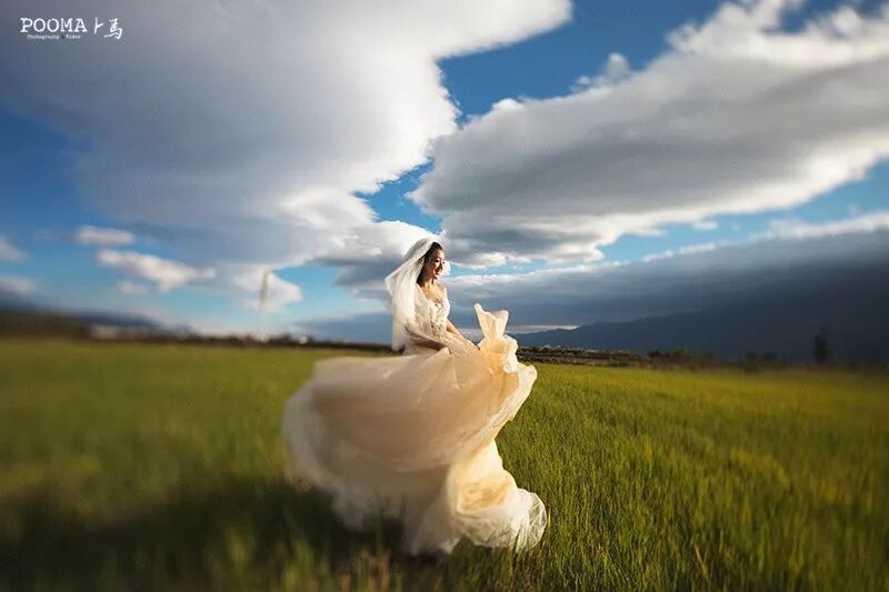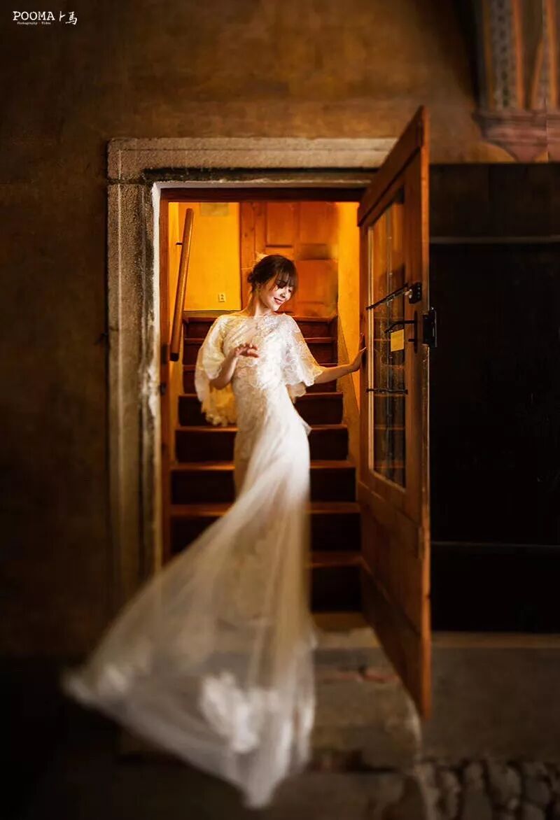 丽江古城里,新娘曼妙的背影在移轴镜头下,产生了一种如童话般的美好、虚无以及梦幻感。