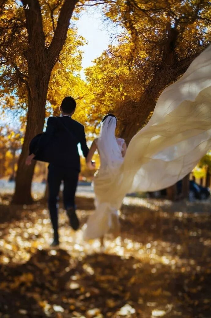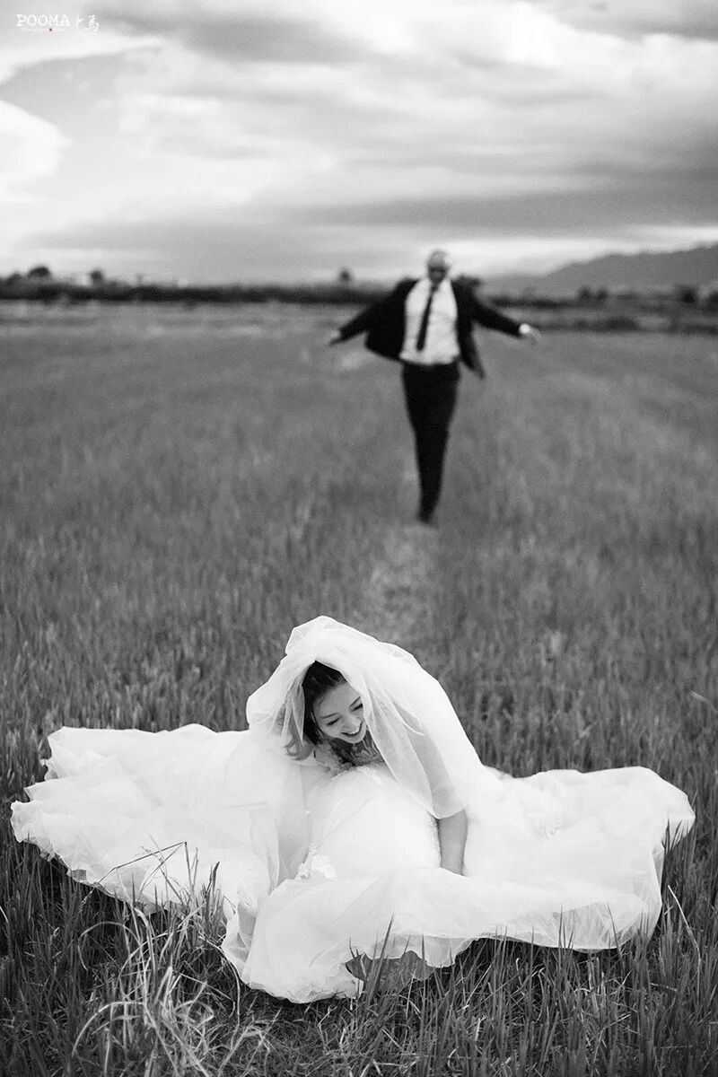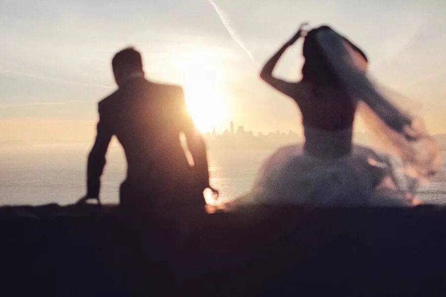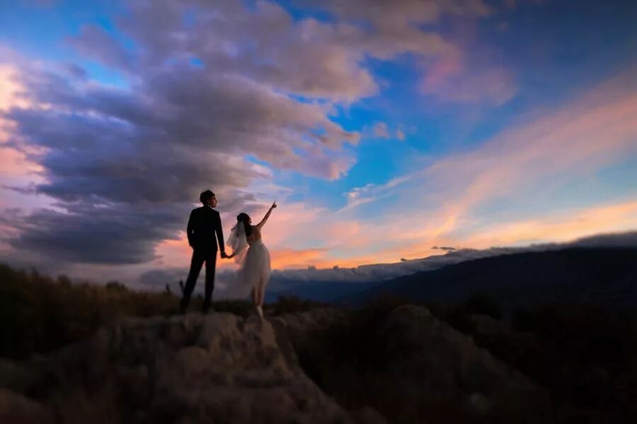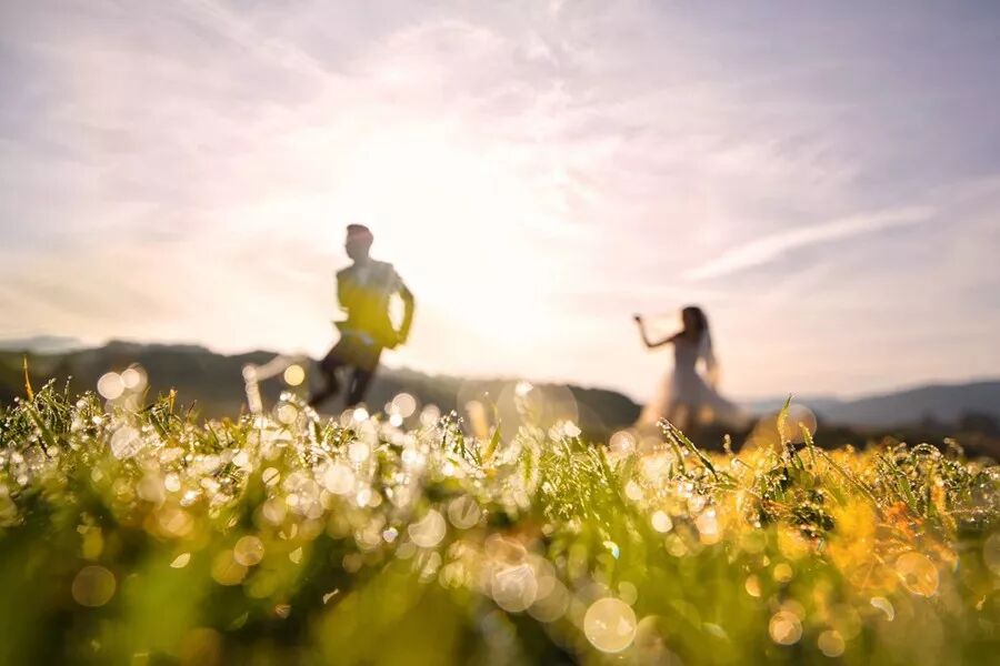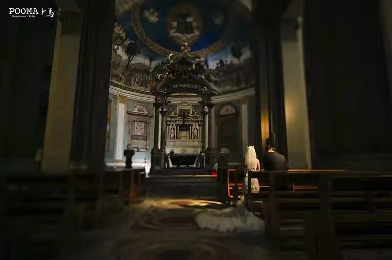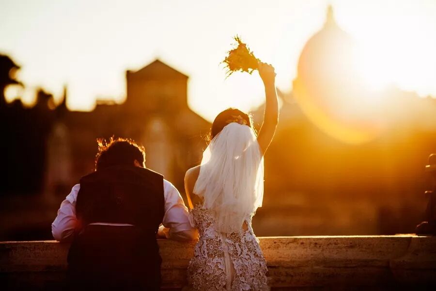 夏季的罗马,新人远眺夕阳中的城堡,光线温暖、梦幻。新娘挥举手中的花束,生动的肢体情绪极具感染力,犹如电影中的情节。长焦镜头抓拍背影,传达出一种意境美,画面更具想象空间。