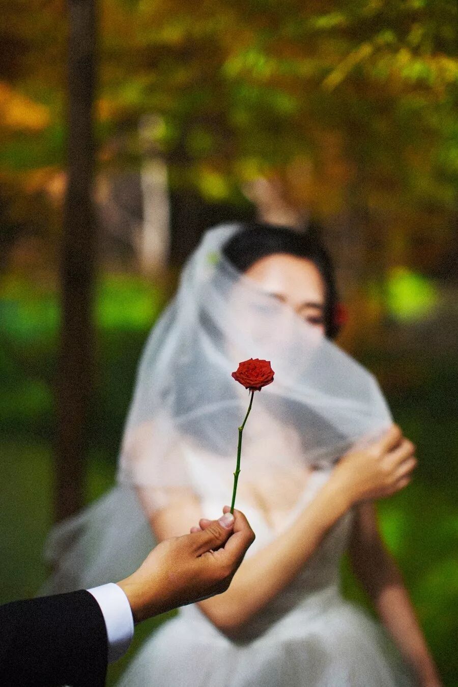 这是一张小品文式的照片。我在画面里设置了一个情景,新郎对新娘表达爱意,送给她了一朵红玫瑰。因为景深很浅,所以拍摄的难点在于抓拍时焦点的准确性。