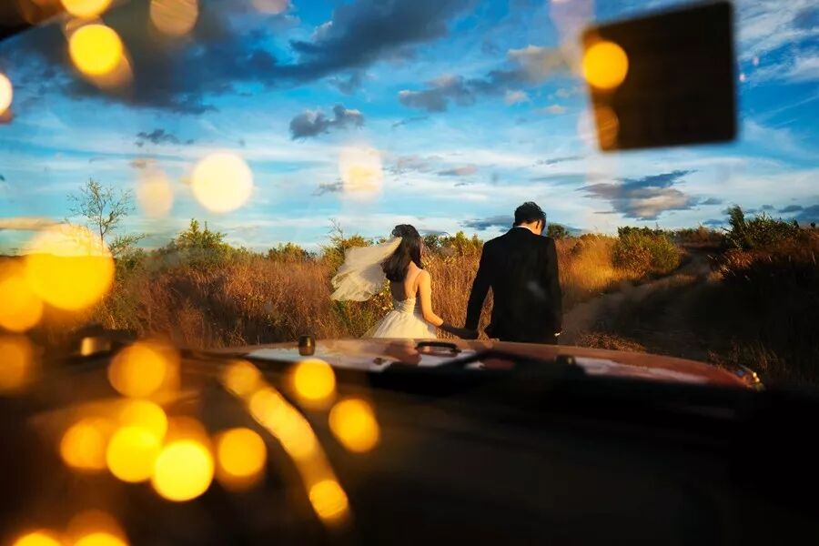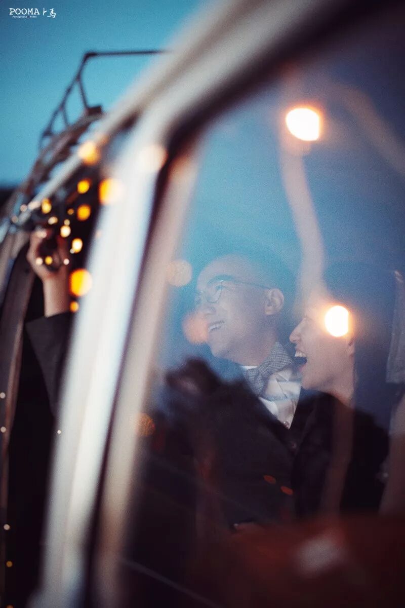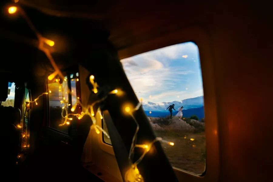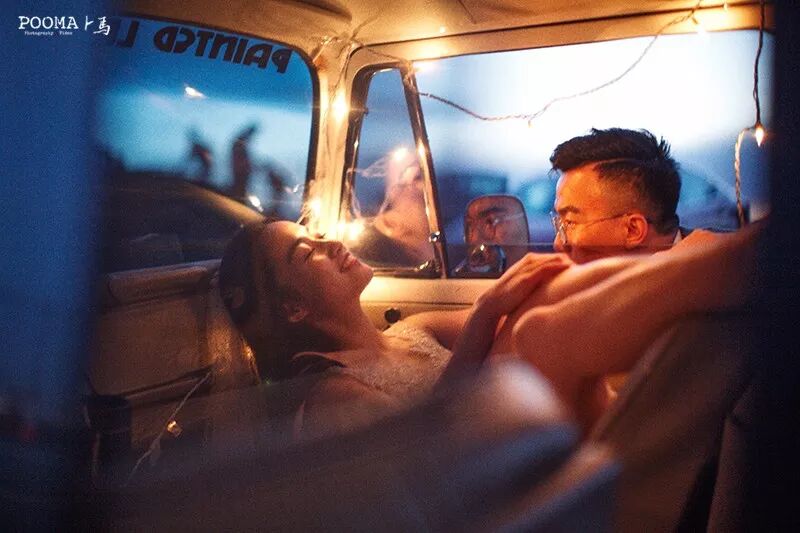 客人租了一辆牧马人,我们用低色温的串灯装饰了车内空间,营造出一种冷暖对比的氛围式前景,透过后排车窗取景,又形成了框架式的构图结构,画面极具电影感。虽然人物的比例很小,但位置和姿态很关键。