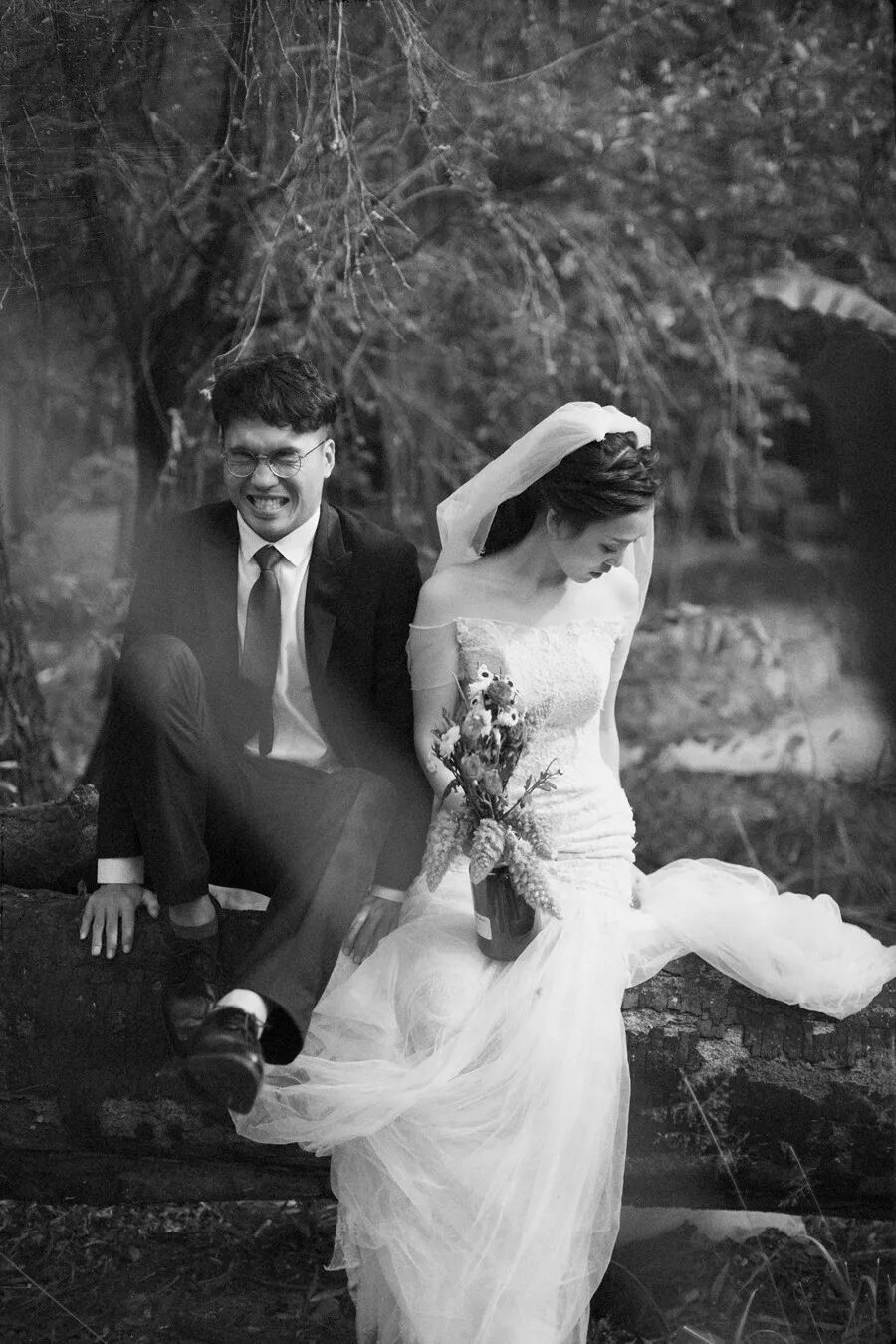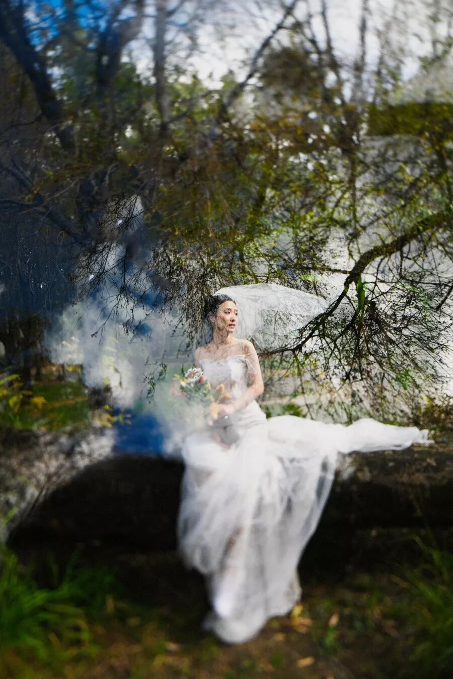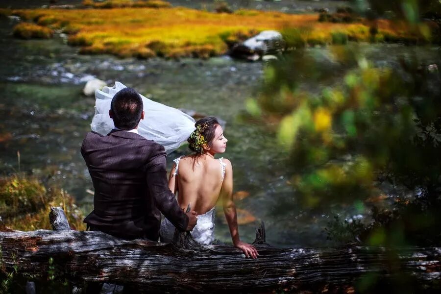 借助树的枝叶作为前景,拍摄坐在水边的新人。整个画面的感觉很好,虚实关系、色彩关系、光影关系,当然还有人的肢体和情绪,整体传递出一种静谧、优雅、轻松、自在的氛围。