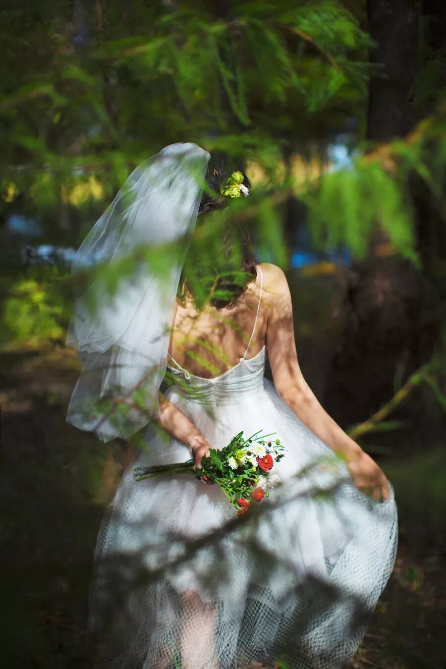 一束明媚的光透过树的缝隙照射下来,人的位置刚好处在光里,强烈的光影对比突显了人物。利用被光照亮的枝条作为前景,增加画面的唯美、梦幻感。我常常被某种独特的形式、线条或是点线面之间的结构关系所打动,利用其作为前景会令画面形成别具一格的趣味之美。
