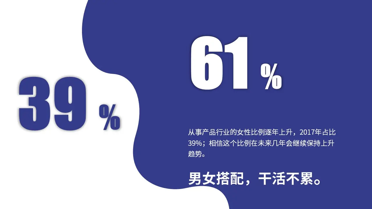 从事产品行业的女性比例逐年上升,2017年占比39%;相信这个比例在未来几年会继续保持上升趋势。男女搭配,干活不累。