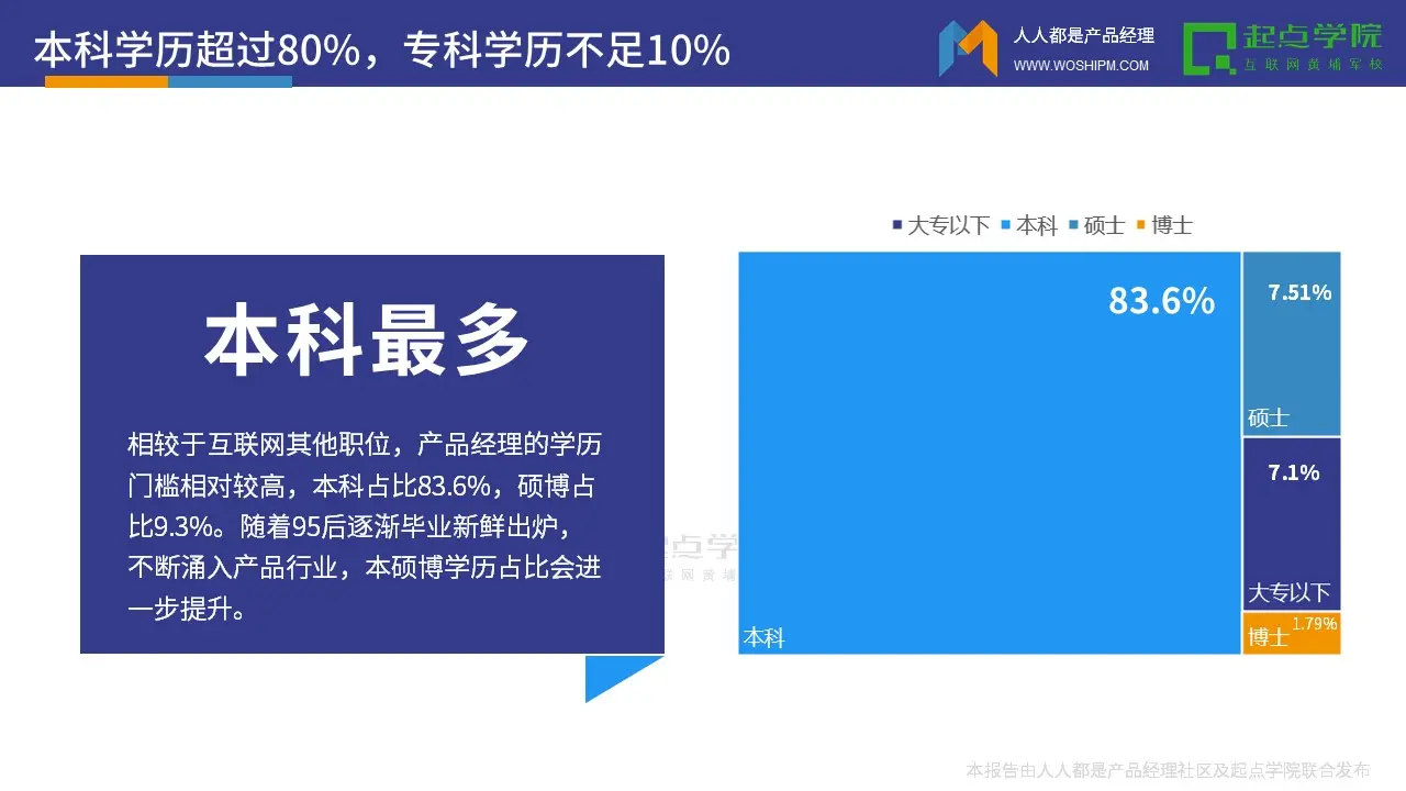相较于互联网其他职位,产品经理的学历门槛相对较高,本科占比83.6%,硕博占比9.3%。随着95后逐渐毕业新鲜出炉,不断涌入产品行业,本硕博学历占比会进一步提升。