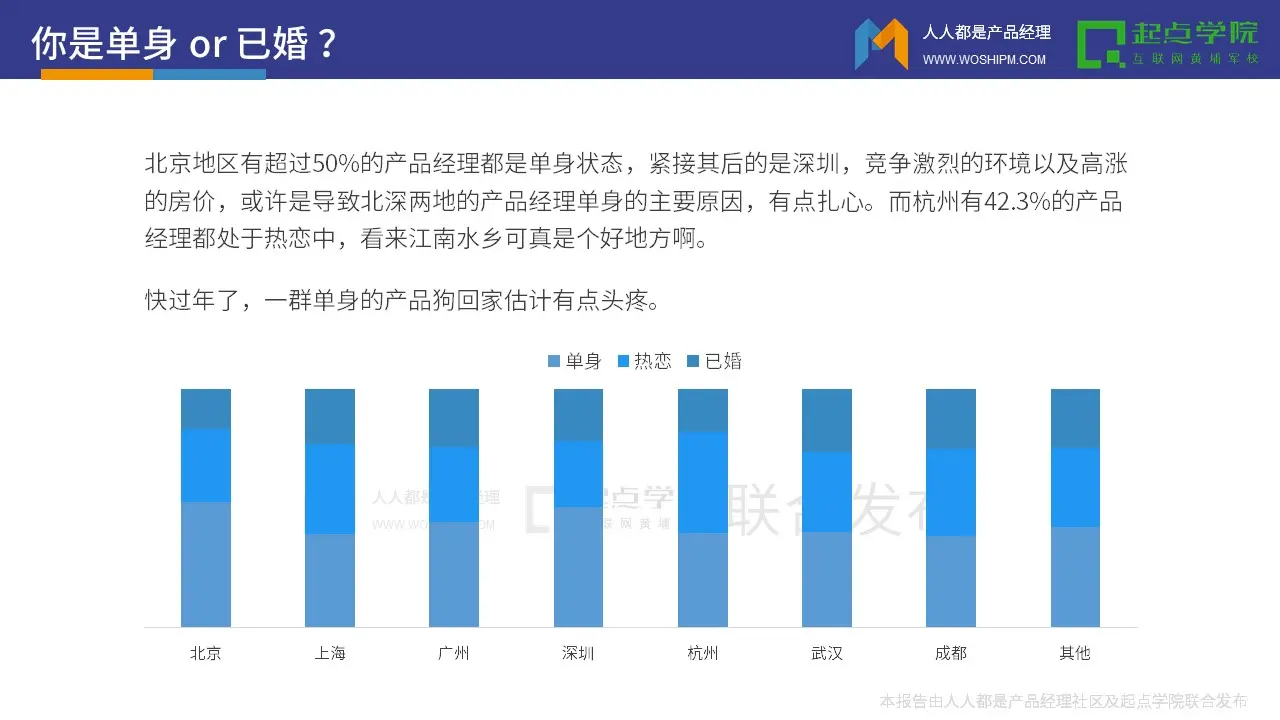 北京地区有超过50%的产品经理都是单身状态,紧接其后的是深圳,竞争激烈的环境以及高涨的房价,或许是导致北深两地的产品经理单身的主要原因,有点扎心。而杭州有42.3%的产品经理都处于热恋中,看来江南水乡可真是个好地方啊。