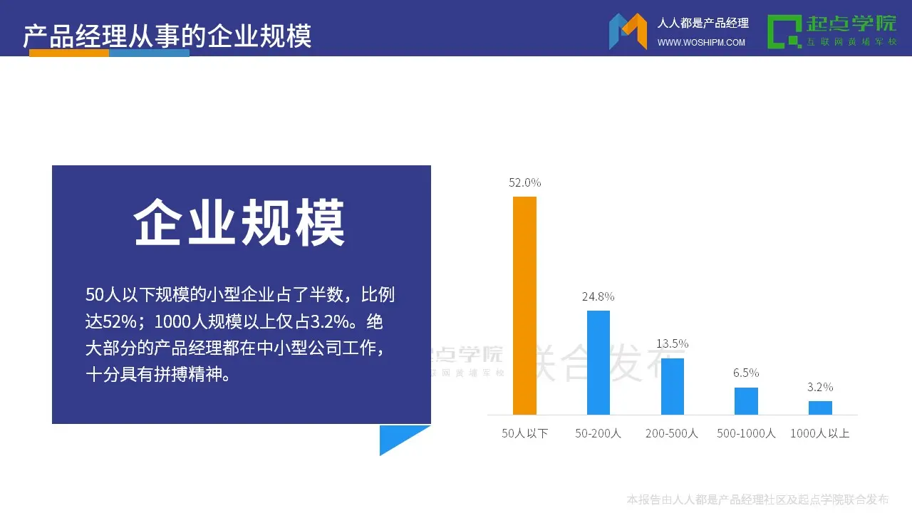 50人以下规模的小型企业占了半数,比例达52%;1000人规模以上仅占3.2%。绝大部分的产品经理都在中小型公司工作,十分具有拼搏精神。