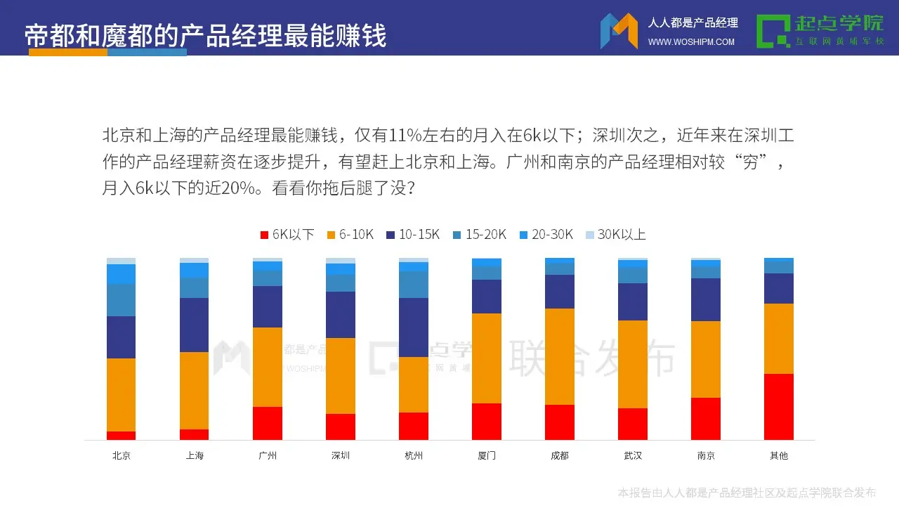广州和南京的产品经理相对较“穷”,月入6k以下的近20%。看看你拖后腿了没?