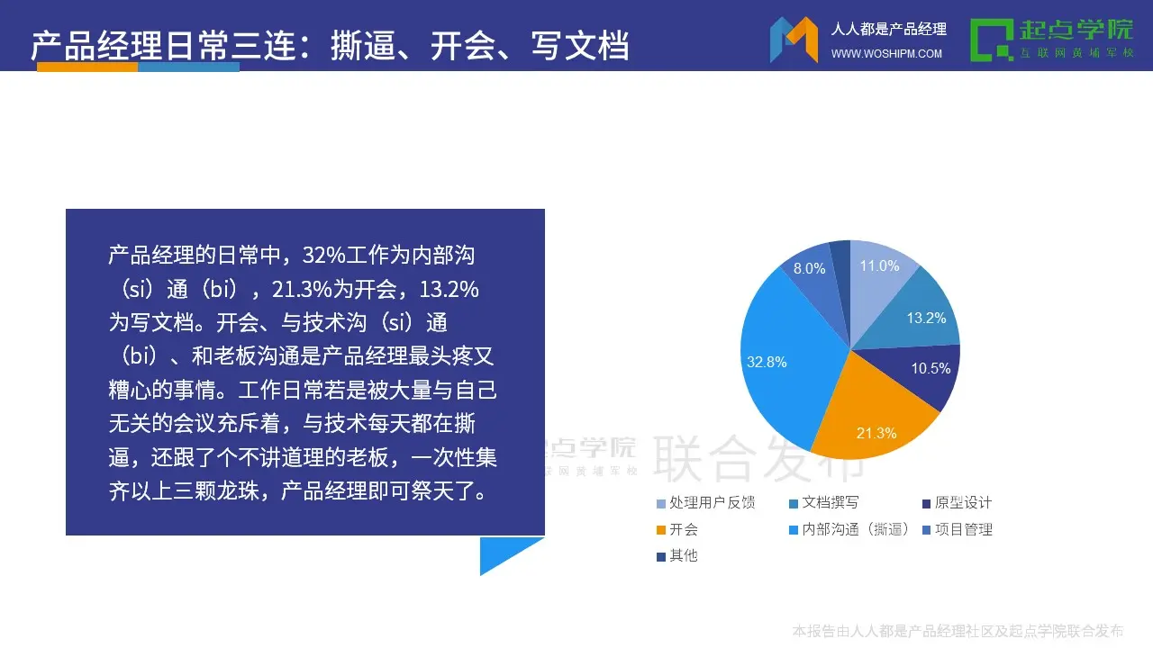 产品经理的日常中,32%工作为内部沟(si)通(bi),21.3%为开会,13.2%为写文档。开会、与技术沟(si)通(bi)、和老板沟通是产品经理最头疼又糟心的事情。工作日常若是被大量与自己无关的会议充斥着,与技术每天都在撕逼,还跟了个不讲道理的老板,一次性集齐以上三颗龙珠,产品经理即可祭天了。