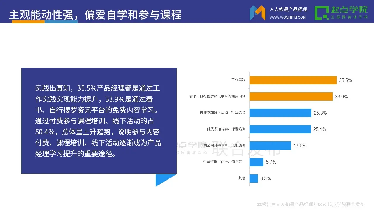 实践出真知,35.5%产品经理都是通过工作实践实现能力提升,33.9%是通过看书、自行搜罗资讯平台的免费内容学习。通过付费参与课程培训、线下活动的占50.4%,总体呈上升趋势,说明参与内容付费、课程培训、线下活动逐渐成为产品经理学习提升的重要途径。