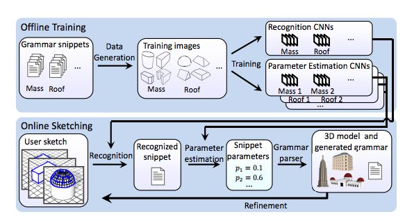 使用(草图,分类标签) 作为输入,基于 CNNs 训练分类模型,建立(草图,分类标签)之间的映射关系。 相当于告诉机器哪张图属于建筑物的哪个组件(属于 window 还是 roof 等)。