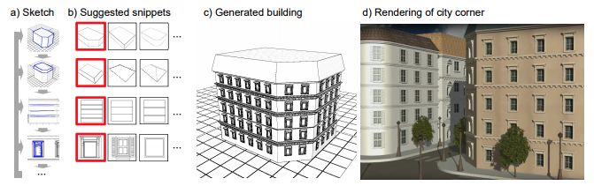 d)系统合成用户的选项(组装 Snippet Grammar ),生成建筑 3D 模型