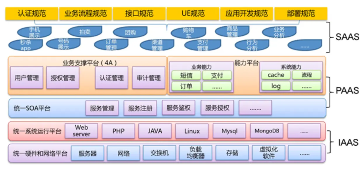 系统层是指系统层面的一些东西,包括系统定位、系统架构、模块抽象、规划蓝图。人们看到体验到的产品都是露在外面的那一块,实际上还有很多系统在海平面以下,或大或小的产品背后总后好几套系统的存在。大的例如下图的唯品会,整个分为SAAS、PAAS和IAAS,每个里面有多个平台多个系统,才能支撑起唯品会的发展。小小的一款APP里的IM、推送等可能都是第三方提供的独立的系统。
