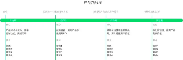 路线图包括产品阶段、里程碑、需求。