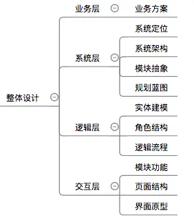 产品的整体设计包括业务层、系统层、逻辑层和交互层等四个层面。基于需求提出业务方案,基于可行可落地的业务方案进行设计。