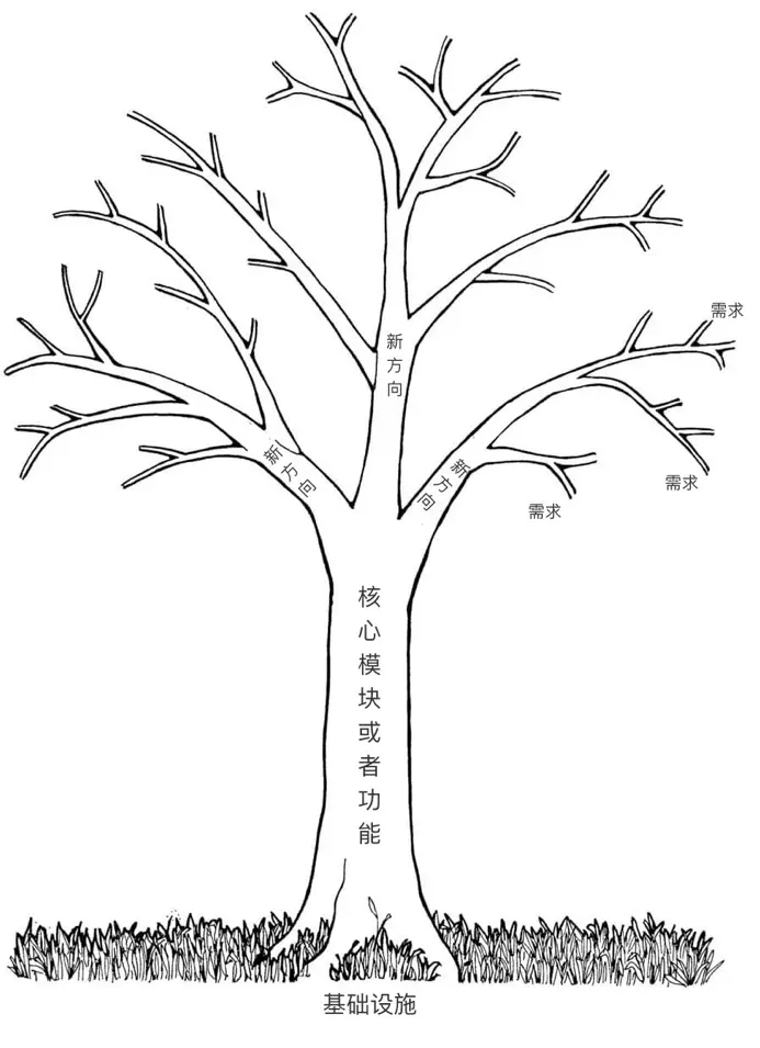 需求树,是为了梳理、分类需求,分析优先级和前后置条件。树根是实现整个系统所必须要的基础设施,树干是核心功能模块,树枝是可以进入的领域或者方向,树枝上也有功能模块。一开始先把核心功能、基础设施和方向领域确定好,然后用便利贴往上贴功能模块或者需求,最后按照越靠近主干越优先的策略调整便利贴的位置。期间整个团队都有一起合作,各抒己见,一起协商这些具体功能或者想法应该怎么发展,一起确定优先级。