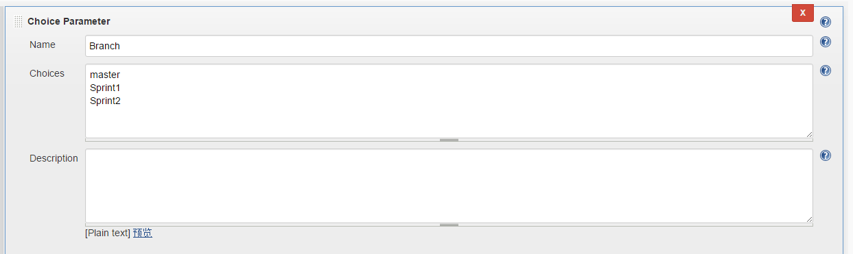 比方说,启动任务时你要能够选择拉取不同分支的代码,那么创建一个Choice类型的构造参数,命名为Branch,可选择的参数就是你Git仓库里的分支名称。例如:master、sprint1、sprint2。当然你也可以创建渠道apk需要打包的渠道名称或者环境名等等。