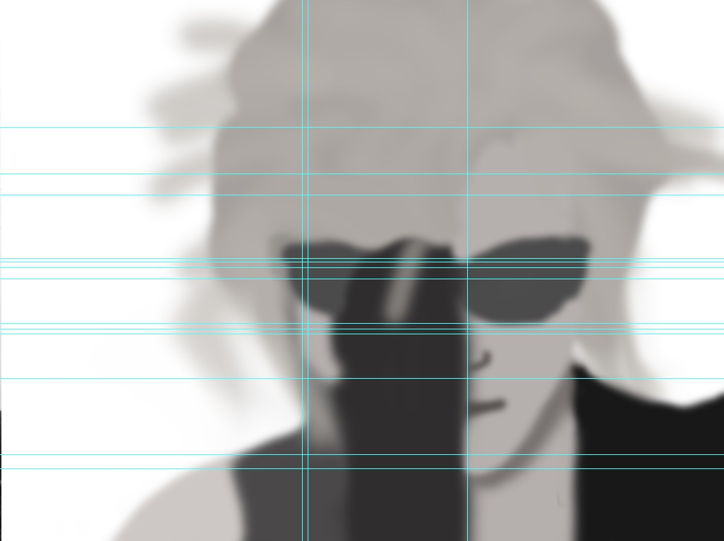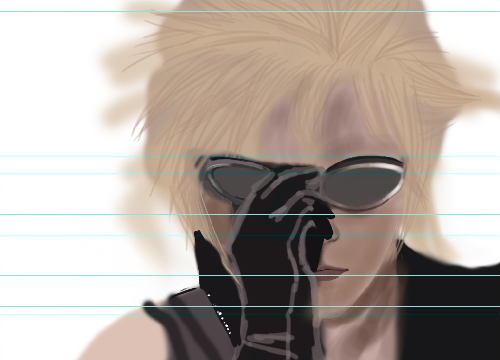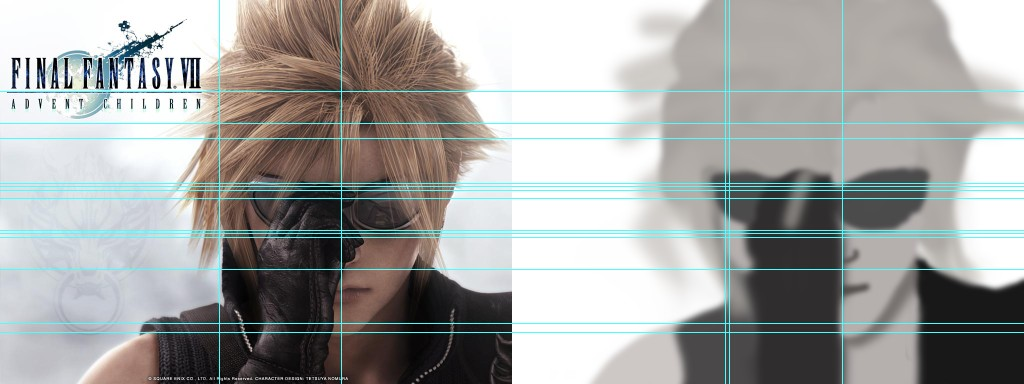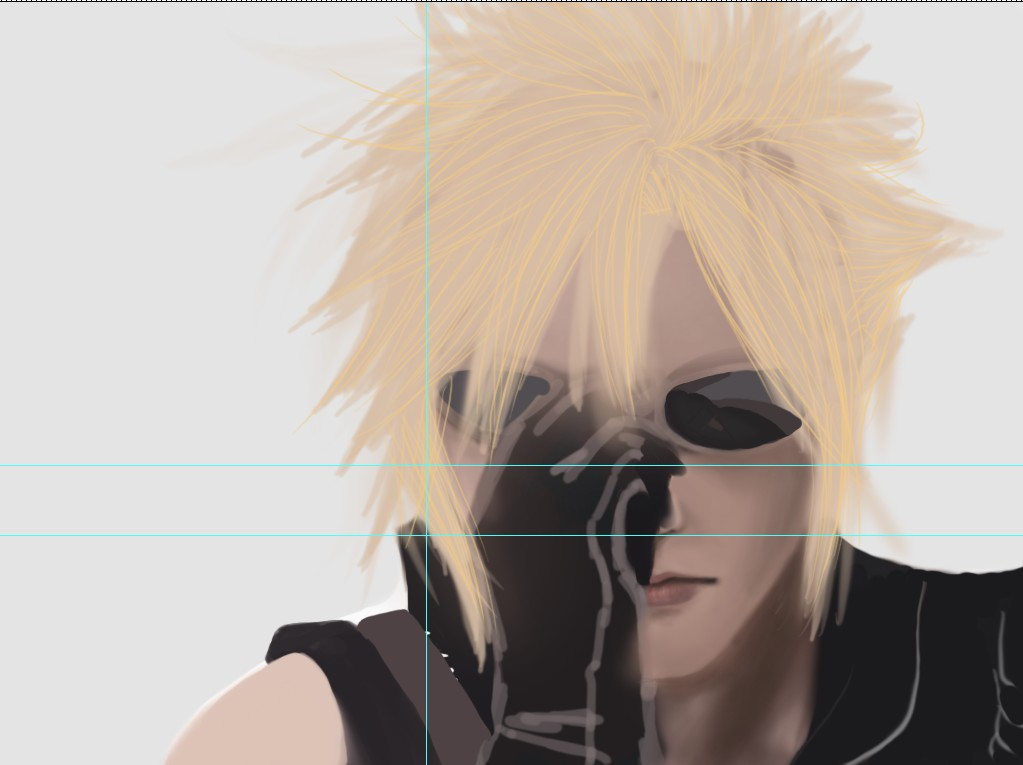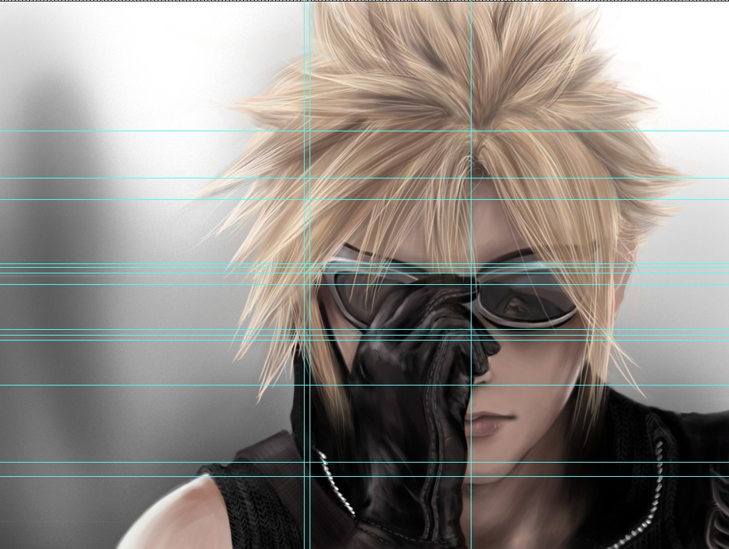 将原图拖到photoshp里,将画布的大小扩大到原来两倍。左边参考图为原图,然后在右边用画笔大致先涂出克劳德童鞋的轮廓。(为防止一开始就偏移比较严重,果断用了ps强大的参考线工具,有点像作弊。。原谅菜鸟。。)