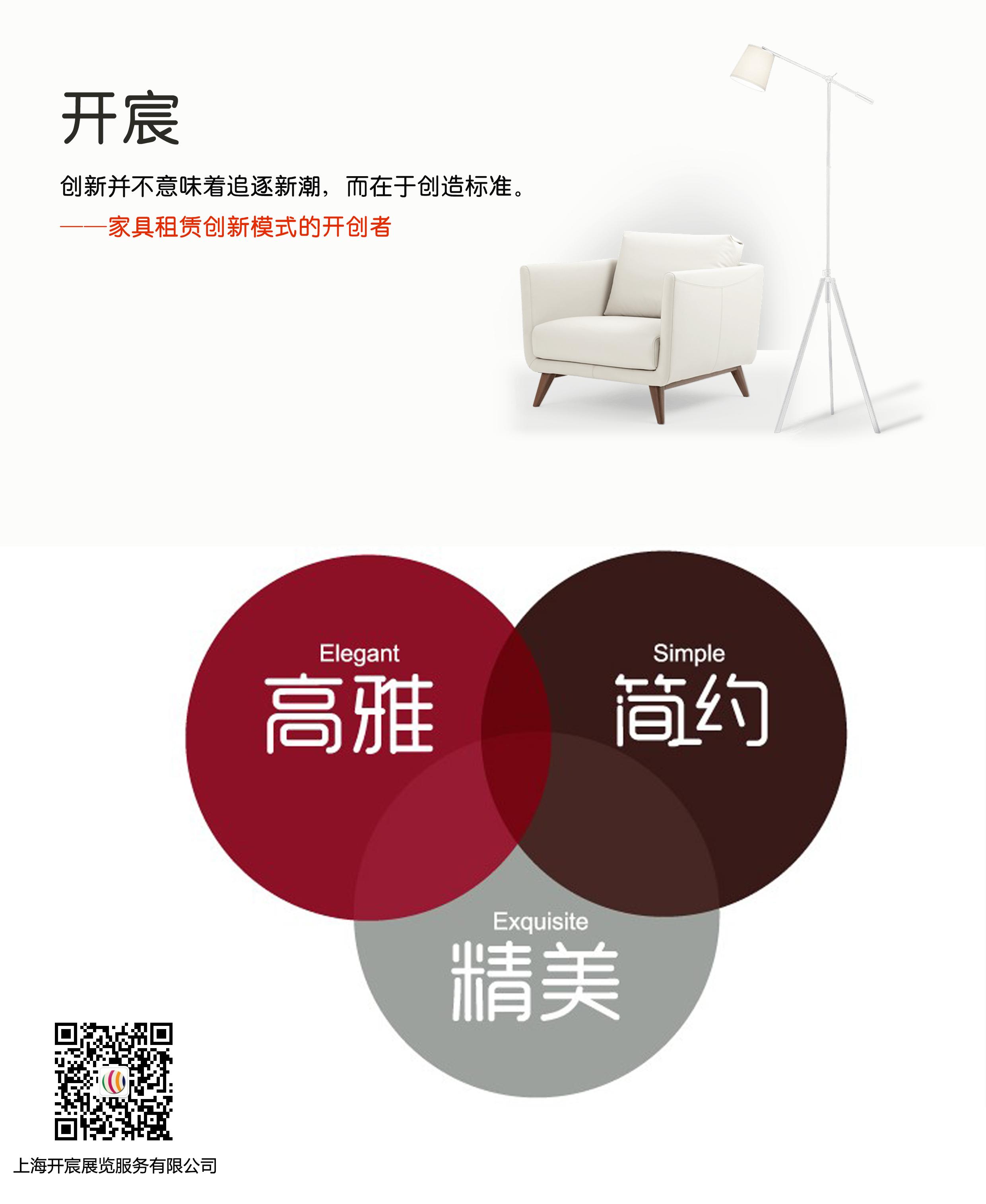 “一生只做一件事,方知不易亦前行”——这就是品牌的匠心,更是上海开宸立于行业的初心!坐落于大虹桥国家会展中心,上海开宸展览服务有限公司致力于解决客户展会中家具租赁以及地毯铺设的供需信息矛盾,并大力研发家具包装设计、仓储运的管理标准系统和模式,为行业服务于客户制定可行性的参考标准和筑建良好的运营渠道,以专业且深刻的理解、认知及优质服务的理念立足于会展行业。让展会主办方、参展商、展会服务商等各方都能有更好的体验,这是上海开宸十余载一直在践行的目标 “互联网+”绝不是简单地将实体搬上互联网,而是要通过互联网去整合行业的全产业链资源。通过高度的整合,更有效的服务于客户。开宸对自己的电商平台有更高的要求,我们为家具的租赁制定标准,我们为家具租赁的“仓、储、运、收”创建模式,在会展行业升级的路径上,我们一直在探索,我们是家具租赁创新模式的开创者……