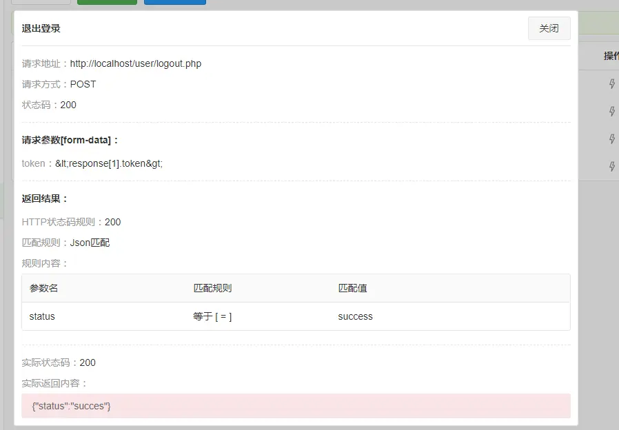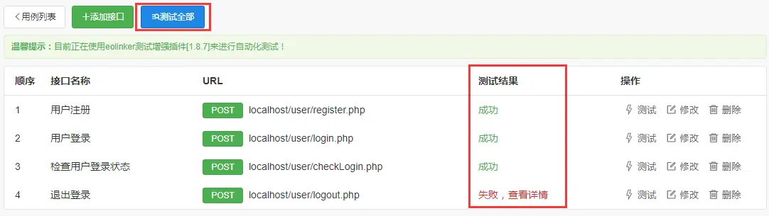编辑完所有的单例之后,就进入到最后的测试阶段。eoLinker可以对单例单独做测试,也可以进行批量的用例测试。 在用例中点击测试按钮就会把所有的API测试一遍,然后遇到报错还会提供相关的反馈信息,比如和预设的结果对比。