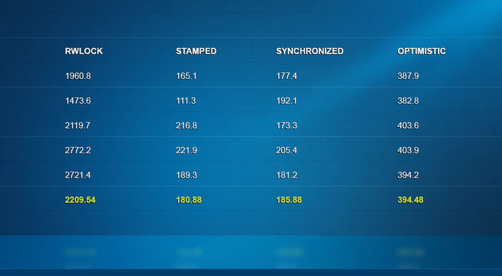 看起来平均表现最佳的还是内部实现的synchronized锁。尽管如此,并不是说它在所有情况下都是表现得最好的。主要是想告诉你,采用哪种锁,应该在你的代码上线前在不同的竞争级别下,并且使用不同的读写线程数来进行详细的测试,根据结果来选择。否则你会面临线上故障的风险。