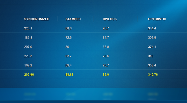 下面,我将竞争级别提高到10个写线程和10个读线程。现在情况开始发生变化了。读写锁要比StampedLock以及synchronized慢了一个数量级。说到乐观锁还是很让人意外,它比StampedLock的读写锁还要慢。