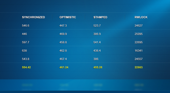 下面,我保持同样的竞争级别,不过将读线程的比重调整了下:16个读,4个写。读写锁再说次说明了为什么它要被替换掉了——它慢了百倍以上。Stamped以及乐观锁都表现得不错,synchronized也紧随其后。