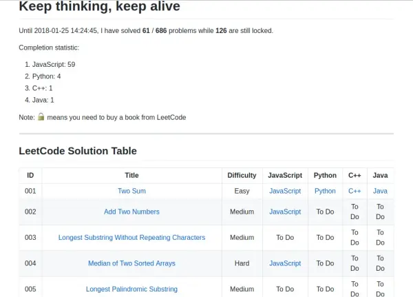 f.write('| ID | Title | Difficulty | JavaScript | Python | C++ | Java |\n')