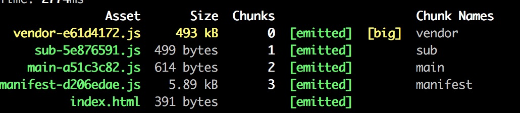 可以看到,动态引入的代码会被单独打包到chunks/里的文件里,而且vendor的值再次发生了改变。造成这个的原因是和moduleID类似,webpack默认使用整数作为chunkID,并且异步加载的chunk会先被赋值。 也就是说在没有动态引入之前,vendor的chunkID是0,动态引入之后,vendor文件的chunkID变为了1,所以造成了内容变化。(上面提到的改变entry顺序也会造成chunkID的变化)