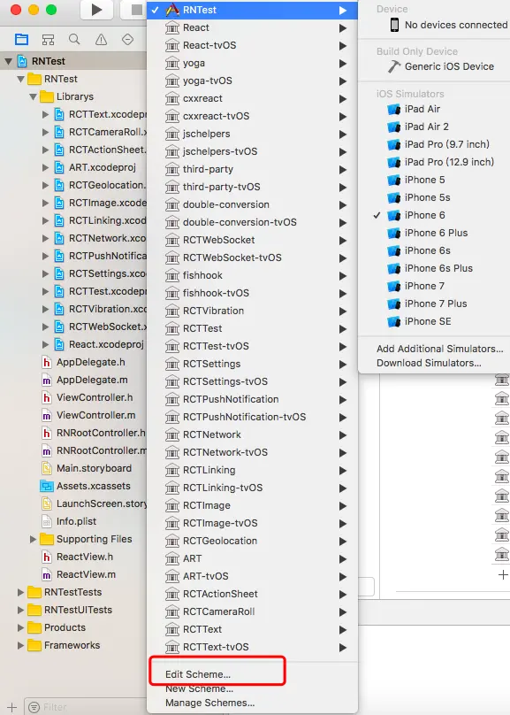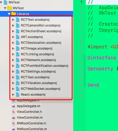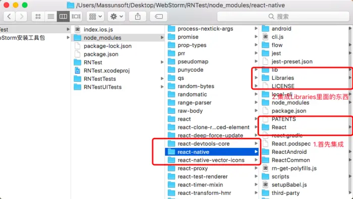 由于项目没有使用Cocoapods进行第三方依赖包管理,所有我们需要手动将react-native工程包添加到我们的原生ios工程中。打开RNtest/node_modules/react-native目录,找到相关的项目包,将React相关的工程包手动添加到项目中:
