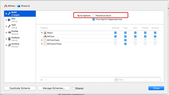 向Edit Scheme的Build中添加React,并拖拽到最上位置,并取消勾选Parallelize Build选项。这一步很关键,因为项目需要先编译React.a文件。