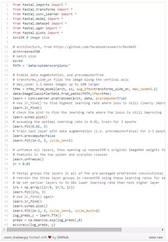 训练集中每个类 [spiders,scorpions] 有290张图片,在测试/验证集中有118张蜘蛛图片和117张蝎子图片。通过一系列训练后,作者采用的模型拥有高达95%的分类准确率。