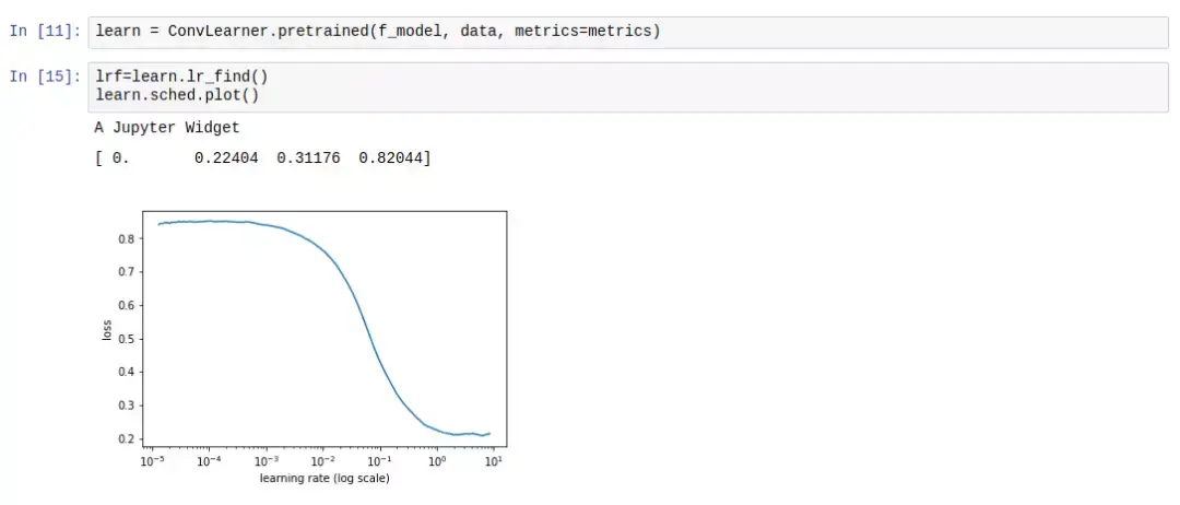 在fastai中,你只需在学习的对象上运行lr_find()函数,学习率退火算法就能发挥效用。同时,sched.plot()函数可以用来确定与最优学习速率相一致的点。